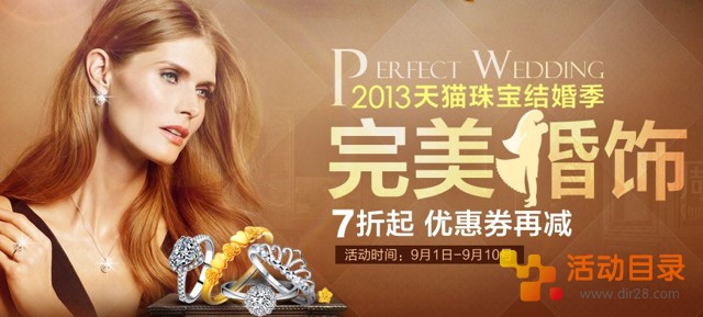 天猫 珠宝结婚季完美婚饰7折起 优惠券再减 限时折扣9月10日止 发布日期:2013-09-05 10:35:28 / 打折秒杀网 • 围观 ... 次 活动介绍: 2013天猫珠宝结婚季,为爱大惠;抢购婚饰产品全场7折起,并能享受优惠券再减的优惠,更有每晚5款特惠饰品限量发售。活动目录网站的网友快去抢购吧! 打折时间: 9月1日-9月10日 活动地址:https://www.huodong8.com/714.html