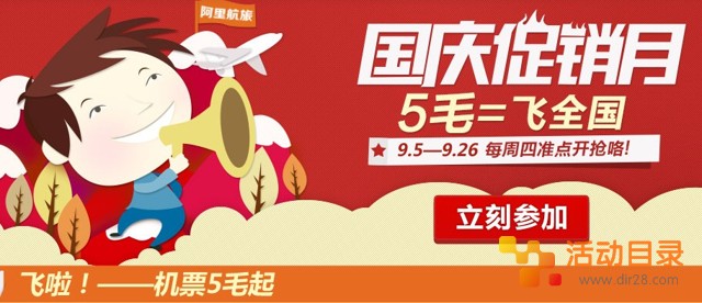 支付宝国庆促销月机票5毛飞全国活动 限时折扣9月26日止