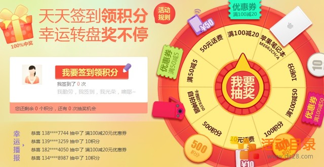 活动期间签到一次可获得30积分,每30积分可参与一次抽奖。获得实物奖品和话费的会员,新一站将于活动结束后7个工作日内统一发放。活动目录网站的网友快去参加试试运气吧!