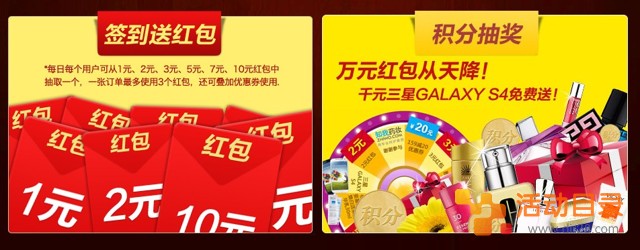 每日签到抽取1元、2元、3元、5元、7元、10元红包其中一张,一张订单最多可叠加3张红包,红包可与优惠券一起使用。六张优惠券免费领取,满99减10(全场券)、满199减25(全场券),满299减50(全场券),满50减50(专场券)、满200减100(专场券)、满150减50(专场券)。活动目录网站的网友快去参加试试运气吧!