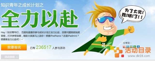 百度知道邀你参与成长计划之全力以赴,回答问题即获抽奖资格,打开梦想宝箱,精彩大奖就马上送你。想要Ipad Nano?还是Ipad Mini?想要就全力以赴吧。活动目录网站的网友快去参加试试运气吧!
