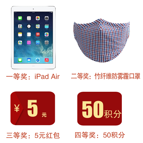 iPad Air(3台),竹纤维时尚PM2.5口罩(50个),5元红包(1000份),宜美健50积分(2000份)