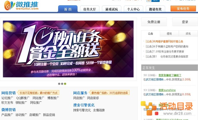 微推推是一个微博转发分享盈利平台,通过该站进行微博活动任务的转发以及分享每条可以拿到0.2-10元不等的现金奖励,金额是按照微博粉丝活跃度来算的,最低1元即可提现,每日必做的微博赚钱平台。活动目录网站的网友快去参加赚外快吧!
