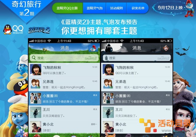 参加《蓝精灵2》QQ全新手机版活动,为自己喜欢的主题投票!分享心仪主题至好友、微博和空间,即有机会参加抽奖;按要求分享活动信息至好友,即有机会获得30Q币,活动结束后统一随机抽取。活动目录网站的网友快去参加试试运气吧!