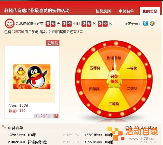 参与上面的宠物投票后,玩家需点击左侧的转盘参加活动。点击转盘上的“开始抽奖”按钮后,即可参加抽奖。每人每天将会有三次抽奖机会!。活动目录网站的网友快去参加试试运气吧!